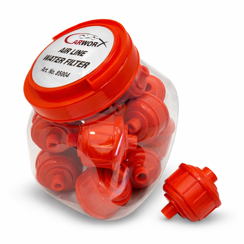 El filtro de aire desechable Carworx está diseñado para eliminar humedad, aceite y partículas contaminantes del aire comprimido, garantizando un flujo de aire más limpio durante trabajos de pintura y aplicaciones neumáticas. Su uso ayuda a prevenir defectos en el acabado de la pintura causados por agua o impurezas en el sistema de aire.